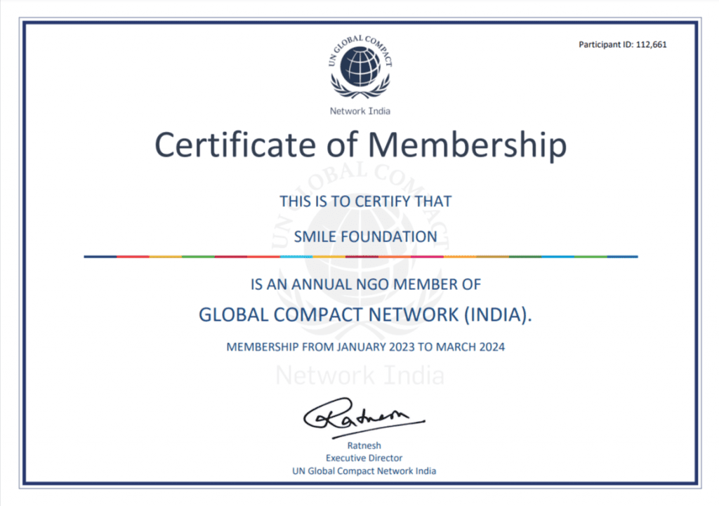 Smile Foundation became a participant member of the United Nations Global Compact, a voluntary initiative that aims to align strategies and operations with universal sustainability principles and support SDGs.