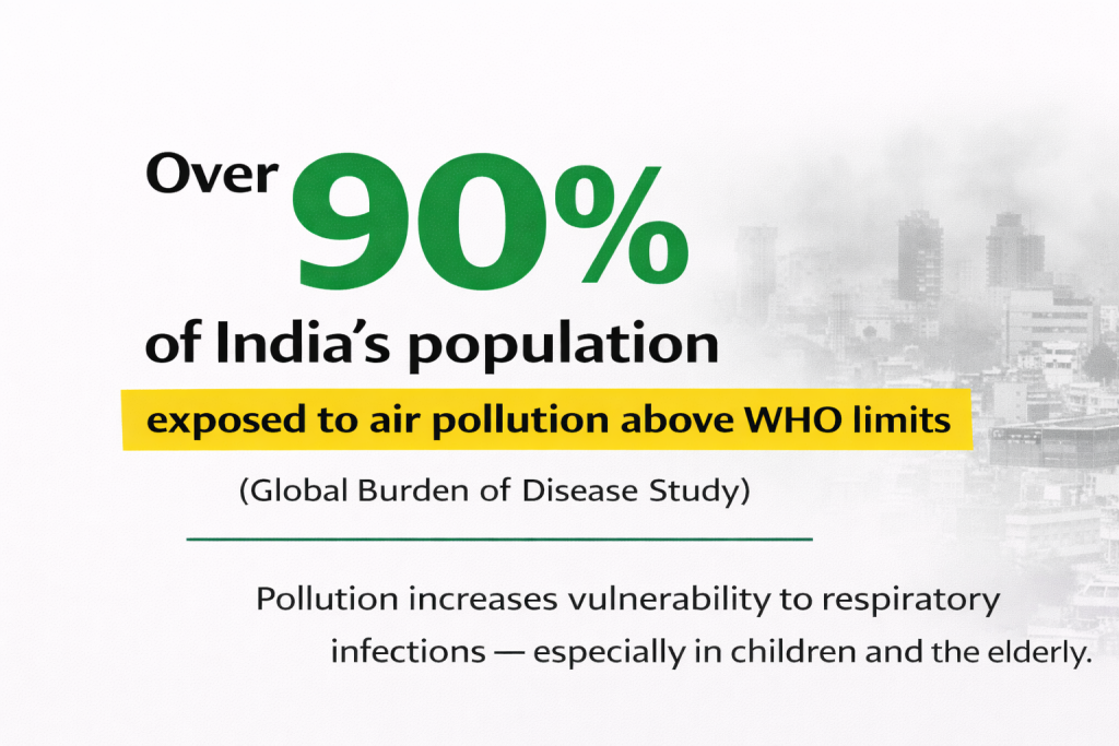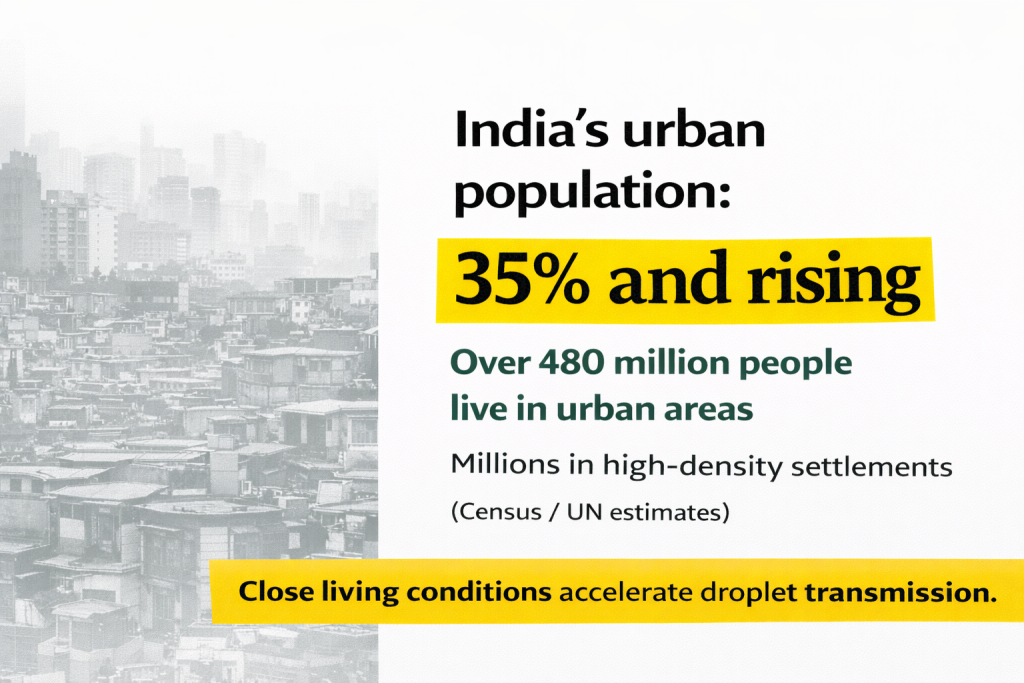 Urban India’s growth has been accompanied by increasing population density in informal and low-income settlements. Crowded living conditions, limited ventilation and shared sanitation facilities create environments where respiratory infections can spread quickly.