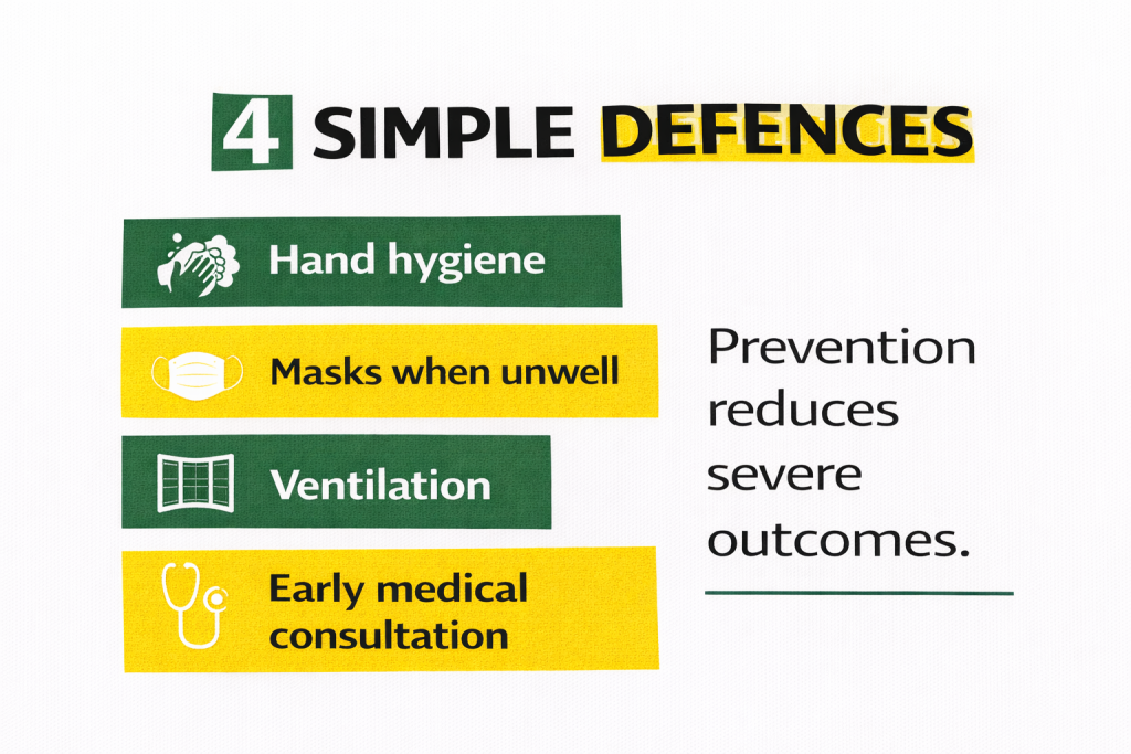 Maintaining hand hygiene through regular washing with soap was reinforced as a first line of defence. Residents were encouraged to cover their mouths when coughing or sneezing and to wear masks when unwell to prevent transmission within households.