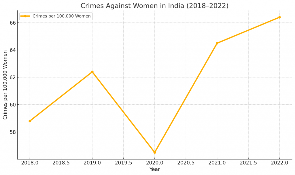 According to the National Crime Records Bureau (NCRB), reported crimes against women in India rose by 12.9% between 2018 and 2022, from 58.8 to 66.4 incidents per 100,000 women. Although this may partly reflect improved reporting, it underscores the urgent need to address GBV through comprehensive, preventative approaches.