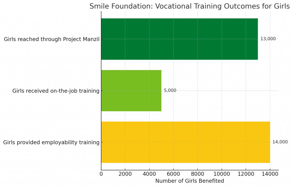 In addition, through Project Manzil, Smile Foundation has enhanced vocational education for girls in Grades 9–12 across six districts in Rajasthan by installing smart TVs and delivering audio-visual training. Over 13,000 girls have benefitted from this digital learning initiative, while more than 14,000 girls have received employability training and 5,000 have accessed on-the-job placements.