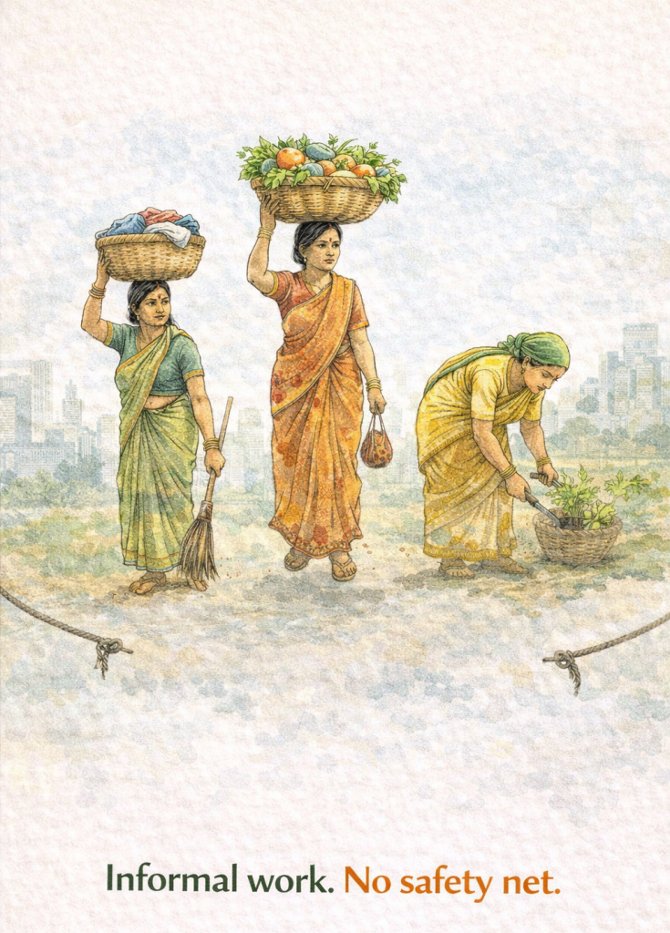 Even among those who work, a large proportion of women are concentrated in informal employment. Informal work — often unregulated and lacking social security — dominates women’s employment in India, limiting access to benefits such as paid leave, healthcare and job security.