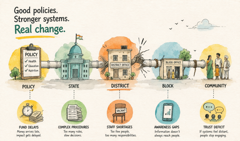India’s development story is often told at scale. It unfolds in district offices, in block-level meetings, in conversations between frontline workers and families. It is shaped by small decisions, daily constraints and the slow work of making systems function.