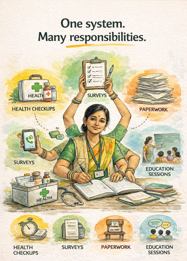 Frontline workers carry the system on their shoulders. ASHAs, Anganwadi workers, nurses, local staff — they are everywhere, doing everything. And often, doing too much.