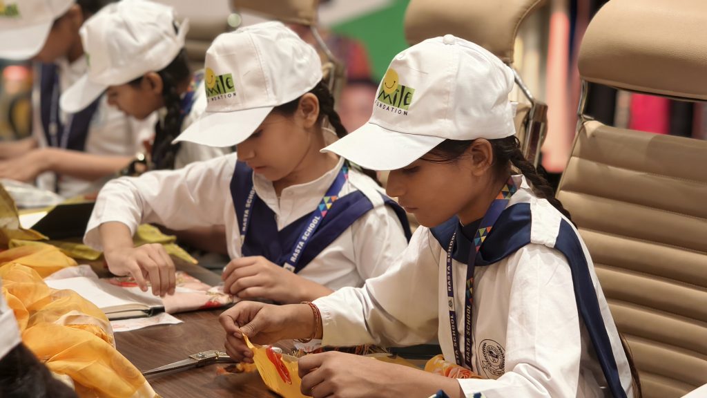 The crisp November sun streamed softly through the large windows of the Lakshita factory, casting a golden glow over the room. Tables were neatly set, colourful bits of fabric lay scattered like little confetti, and the air buzzed with excitement. This wasn’t a regular day at Lakshita. It was a day when fashion met purpose and creativity became a bridge between hearts. As the girls from the Smile Foundation’s education centres walked in, their eyes widened with excitement. Bursting with energy and curiosity, they looked around in awe at the swatches of embroidered fabric, sequins, threads, and beads that surrounded them. The Lakshita team greeted the children with warm smiles and open arms, ready to spend a day not just making things, but making memories.
