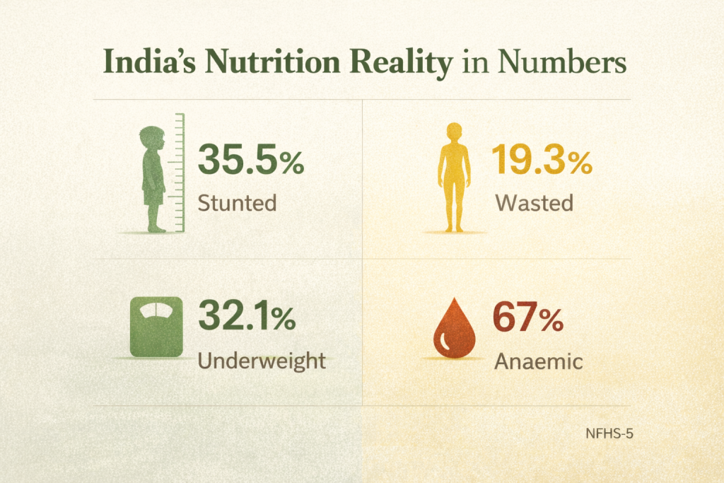 Malnutrition refers to deficiencies, excesses or imbalances in energy and nutrient intake. In the Indian context, the dominant concern continues to be undernutrition, particularly among children under five and women.
