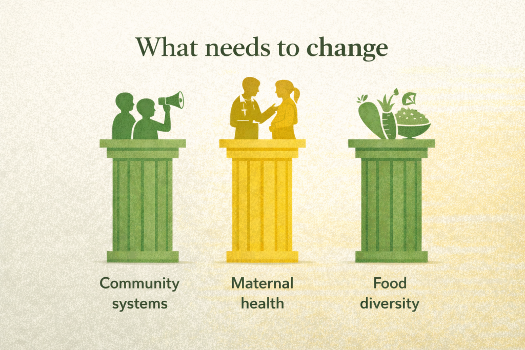 It also requires recognising that nutrition is not a standalone issue. It is linked to health systems, food systems, and social protection.