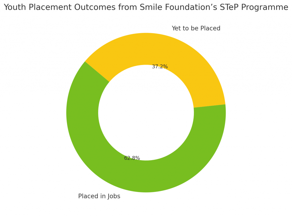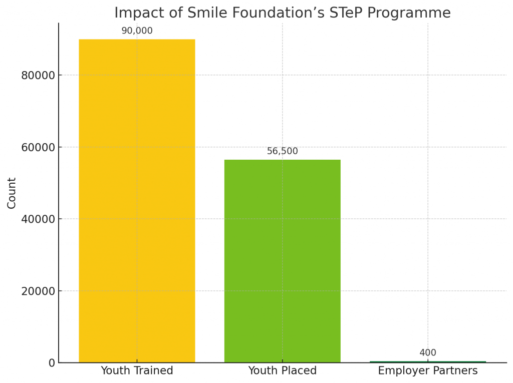 Through its flagship Smile Twin e-Learning Programme (STeP), Smile foundation offers comprehensive training in employability, digital literacy, healthcare, retail, banking, and communication skills across 74 centres in 8 states. With over 90,000 youth trained and more than 56,500 placed in jobs via partnerships with 400+ employers, STeP exemplifies how grassroots implementation can be scaled for systemic impact.