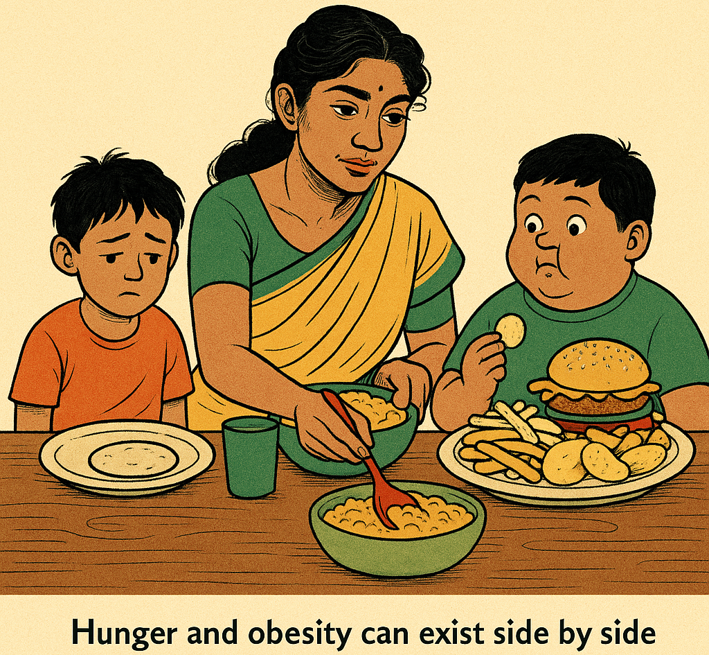 - Generational cycle: Here’s a less funny fact – an undernourished child can grow up with health problems that make them prone to obesity later. For instance, if a foetus doesn’t get enough nutrition (say the mother was undernourished during pregnancy), the child’s body might become super efficient at storing fat (a survival mechanism). Later in life, if that child eats a high-calorie diet, they might easily become overweight or develop heart disease. Meanwhile, women who become overweight (yet nutrient-deficient) can have complications in pregnancy and risk giving birth to babies who are underweight or have developmental issues. This intergenerational cycle means undernutrition and overnutrition can feed into each other across a family’s timeline.