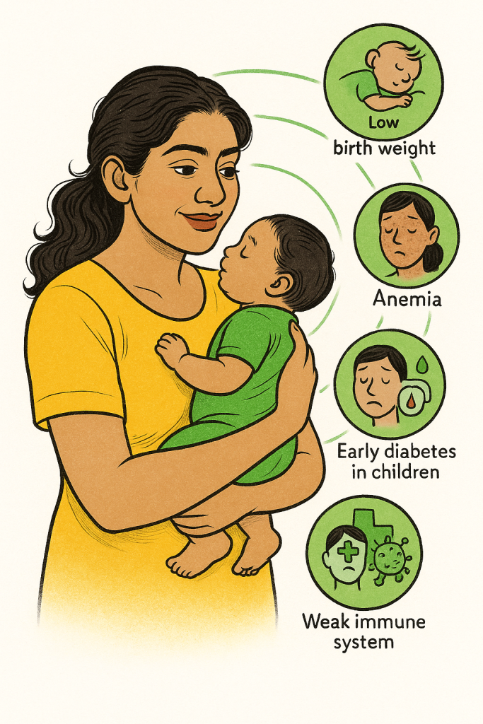Mothers: Consider an expectant mother in a low-income community. If she’s undernourished (perhaps anaemic and underweight), her baby might be born underweight or premature, immediately at risk of growth and developmental problems. Now imagine another mother who is overweight but nutrient-deficient (yes, that’s possible – living on polished rice and maybe sugary tea, for instance). She might face gestational diabetes or hypertension and her baby could grow larger than normal in the womb or conversely also face malnutrition if the quality of her diet is poor. In both cases, the child’s future is impacted. In India, over 52% of pregnant women are anaemic (low in iron) – that’s a form of malnutrition that can cause fatigue, complications in childbirth and affect the baby’s growth. At the same time, rising obesity among women means more cases of diabetes and C-sections, which interestingly have been linked to higher odds of mother-child double malnutrition (one study found mothers with C-section births had higher risk of an undernourished child combined with maternal overweight). It’s a lose-lose situation we must turn into a win-win.