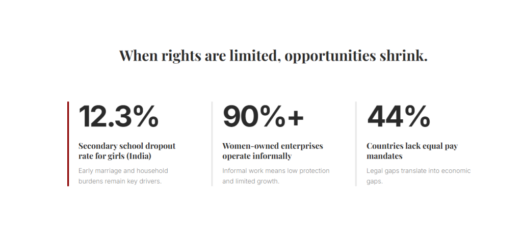 A new UN Women report finds that no country grants women full legal equality, globally women hold only about 64% of the legal rights that men enjoy[1]. These gaps, from weak equal-pay laws to laws allowing child marriage, leave women exposed to discrimination, violence and exclusion throughout life[1][2]. For instance, in nearly 75% of countries, girls can still be legally forced into marriage, and 44% of countries have no equal-pay requirement[2]. These legal shortfalls translate into lost opportunities: girls drop out of school and women stay out of the formal workforce. In India alone, 12.3% of secondary-school girls drop out, often due to early marriage or household pressures[3]. With laws lagging, organizations like Smile Foundation step in on the ground, strengthening girls’ education and women’s economic agency to counter these structural barriers.