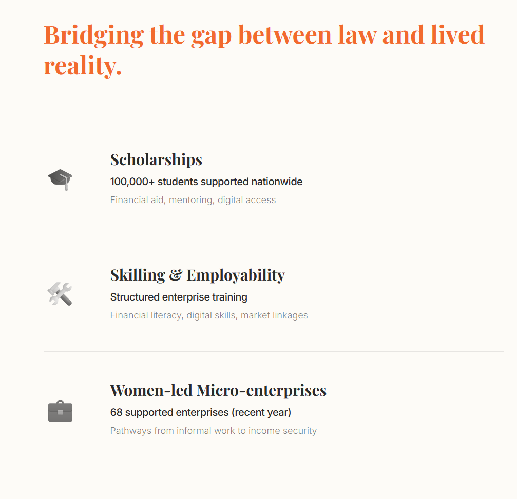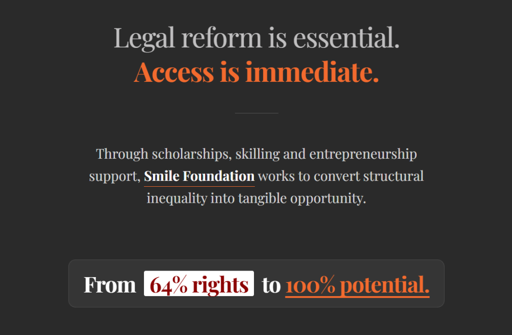 The UN report makes clear that legal reform alone won’t happen overnight. Discriminatory norms persist even where laws exist[15]. That’s why Smile Foundation’s model is so aligned: it works at the community level to translate opportunities into access. While advocacy pushes for better laws, Smile gives women the skills and support they need today. By keeping girls in school and training women to start businesses, Smile helps bridge the gap between rights on paper and rights in practice. Each scholarship or entrepreneurship workshop is a step toward the equality that law promises but has yet to deliver.