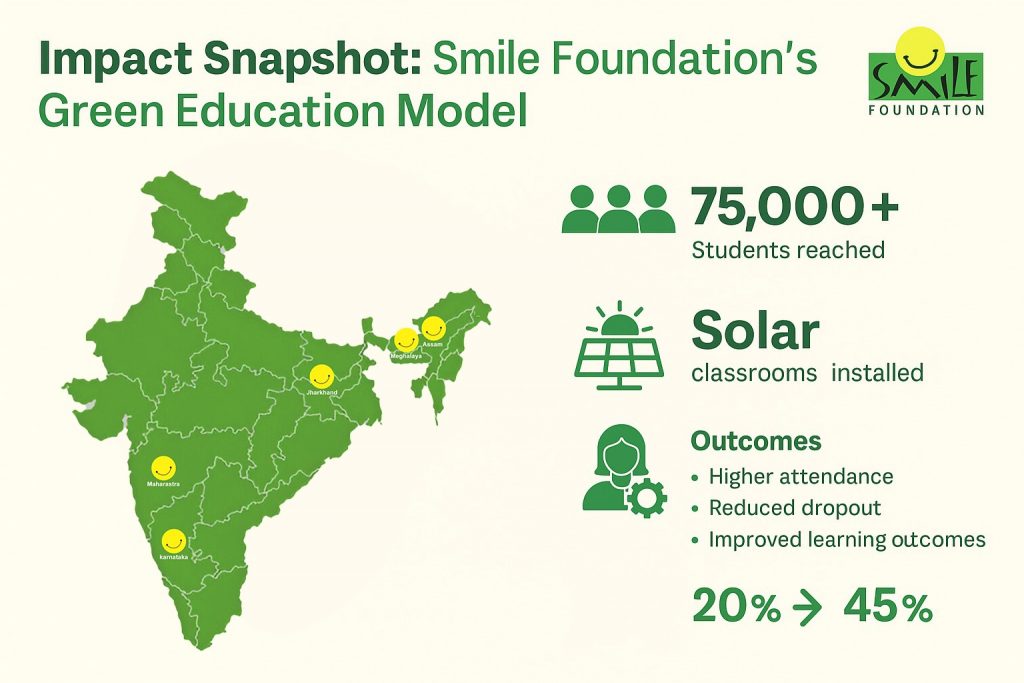 On the global front, UNESCO’s Education for Sustainable Development (ESD) agenda and the Greening Education Partnership stress climate-informed pedagogy and school infrastructure. UNESCO highlights that schools must walk the talk by greening learning environments. In fact, the UN’s 2030 Agenda for Sustainable Development ties these threads neatly. SDG 4 (quality education) and SDG 7 (affordable clean energy) intersect in solar classrooms, while SDG 13 (climate action) is advanced when students adopt renewable power. Smile Foundation’s work is a microcosm of this synergy. Our projects are mapped to multiple SDGs, and indeed they now benefit 75,000+ students across 500+ schools in 9 states with these green-learning investments.