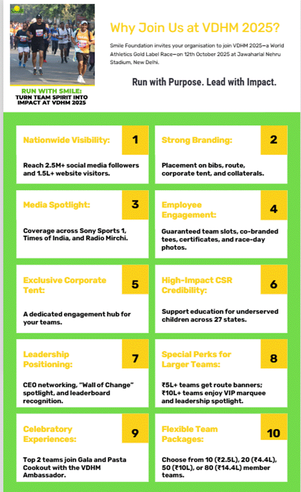 For corporates, running at the VDHM 2025 with Smile Foundation is an opportunity to dive into the depth of goodness of health and spread the power of education, for over 2 lakh children from the underserved communities.