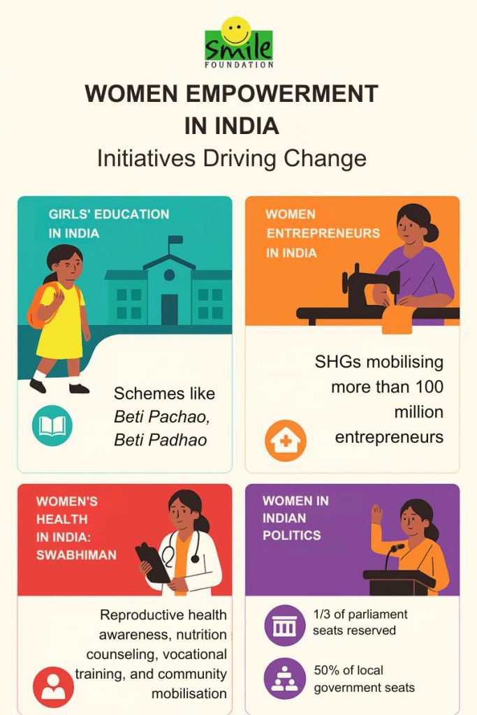 In sum, India’s women’s empowerment is a long arc with many actors: governments at all levels, NGOs like Smile Foundation, grassroots leaders, families and the women themselves. Their progress has been uneven and contested, but unmistakable. As one scholar notes, making women part of the growth story is not only a matter of justice but of national survival. The work continues – from Haryana’s looms to Delhi’s parliament – weaving an Indian society ever more inclusive of its women.