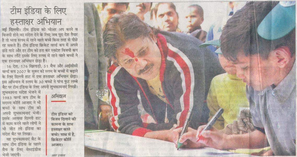 To cheer and pray for Team India’s win in the World Cup, 2007, the slum children of Delhi joined the whole nation to applaud the team leaving for the tournament.The fever of World Cup is increasing and to take it further, the slum children came together for a signature campaign organized by Smile Foundation. The campaign was organized in Dilli Haat and the slum children scribbled their loving messages on specially made bats for the occasion. Mr. Kirti Azad, a member of the 1983 World Cup winning team of India was the guest for the signature campaign and he also cheered for the Indian team. These messages for their beloved heroes will be sent along with the bat to West Indies.