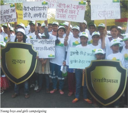 A sensitization campaign – Suraksha aur Swabhiman, (security and dignity for women) was organized at Jantar Mantar, in New Delhi. This was an effort to sensitize male members of the society and to ensure their participation for making the society safer and friendlier for women. In order to intensify the issue and to find a proactive solution in the form of involving men, some sensitizing activates like slogan writing, street play, poems, one-act play, caricatures, etc. related to the issues of safety, security and dignity for women were conducted. Few young boys and girls came together symbolically to show the way towards making a safer and better place for women. The youth came forward enthusiastically and participated in the campaign