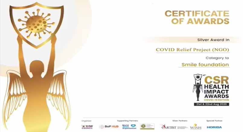 Smile Foundation was honored with the CSR Health Impact Awards 2020 under the Silver Award category of ‘COVID Relief Project (NGOs)’ for its extensive Dry Ration Distribution Program that aided thousands of migrant workers, women, children and the elderly under its initiative India Shares. Indi Shares is a multi pronged approach to the ongoing Covid-19 crisis which includes a comprehensive Food Supply Programme, A telephonic and digital Health Awareness Initiative, Baaton Baaton Mein Sehat and an initiative, Health Cannot Wait to take primary healthcare to the door steps of the underprivileged.