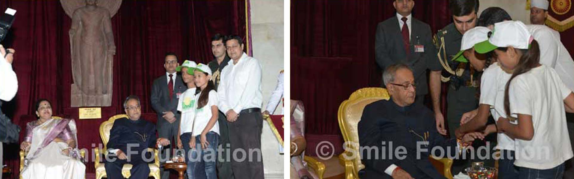 The President of India, Sh. Pranab Mukherjee met Smile Foundation children during a specially organized Raksha Bandhan ceremony at the Rashtrapati Bhavan, in New Delhi. First Lady Smt. Suvra Mukherjee accompanied him in encouraging the children.