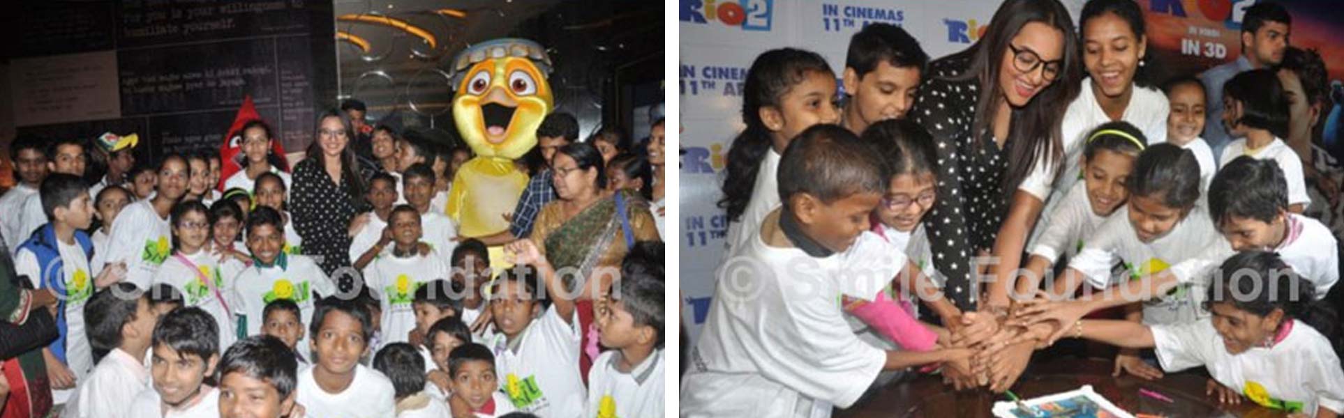 Bollywood Actress Sonakshi Sinha, who has lent her voice for the Hindi version of animated movie Rio 2, organized a special screening of the film for Smile Foundation children in Mumbai. In a day full of fun and fiesta, the children had a memorable time and were thrilled to watch the movie along with Sonakshi.