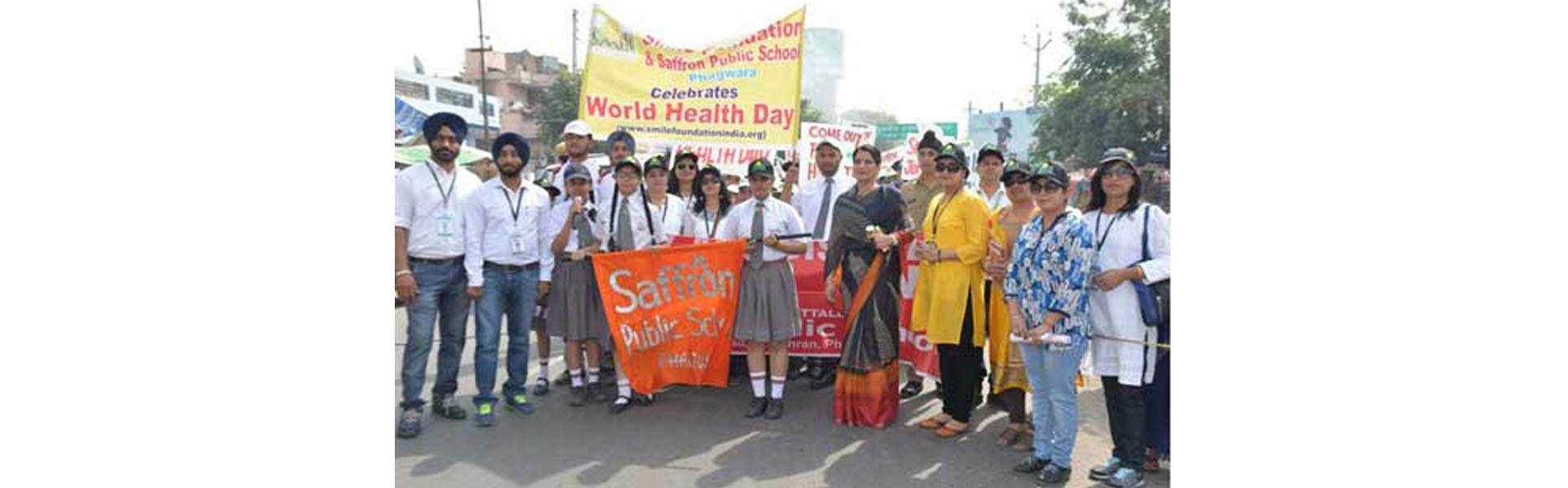 A massive rally was organized on the occasion of World Health Day by the students of Saffron School, Fagwada in collaboration with Smile Foundation under the guidance of their Principal. The rally was flagged off by the Principal Dr. Sandeep Sood. Students from 6th to 8th standard and the teachers participated in this rally. The co-ordination of the rally was maintained by the N.C.C cadets of the Saffron School. The rally was taken around all the major places in Fagwada namely, Hargobind Nagar, Loha Mandi, Gandhi Chowk etc. Slogans regarding health and health awareness were raised by the students. The rally ended in Barmani Park. Smile Foundation was an active participant and helped organize the rally.